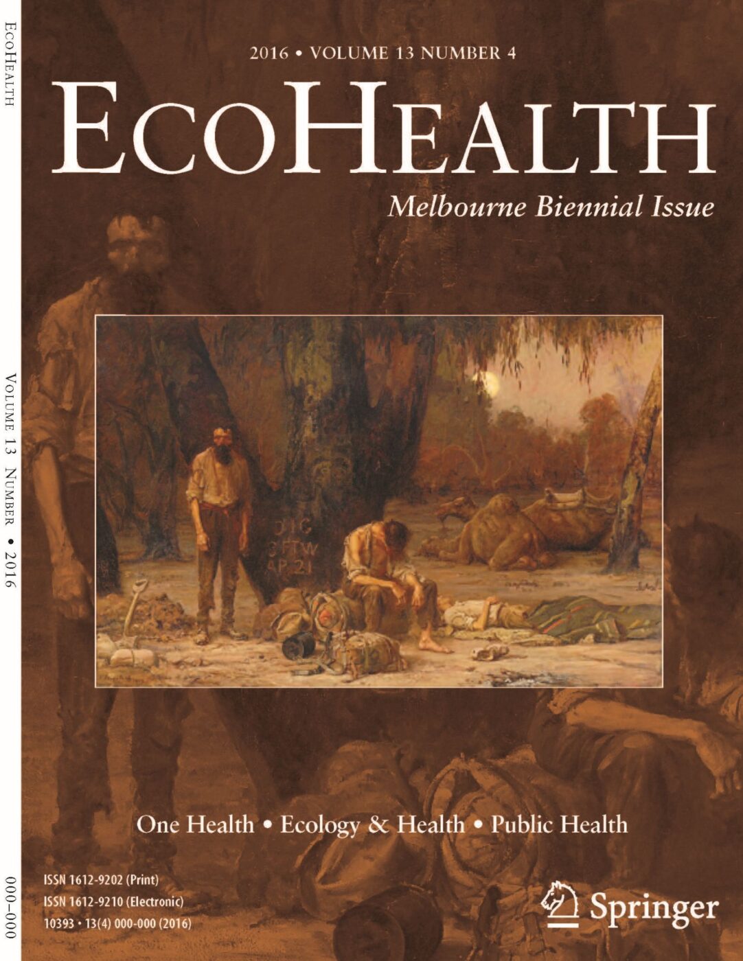 Dr. Daszak sums up the enthusiasm at Nature Health Global by commenting: “This journal has a very special connection for me. I was there at the inception and worked for over a year with our Founding Editor-in-Chief Bruce Wilcox to find a publisher and help fund the journal. I’ve spent endless hours working with artists and our artist-in-residence, the poet Mark Olival-Bartley, to show how we can fuse science and art to bring a deeper context to our natural (and unnatural world). I wrote many of the cover essays, and some have deep personal meaning to me. For example, in 2010, to coincide with an IAEH conference in London, UK, we decided to avoid cliché’d images of pastoral England, and instead used a rather miserable painting by L.S. Lowry, of the polluted cemetery outside my hometown of Manchester – the real story of the UK’s EcoHealth journey, summed up in my essay “My Jerusalem, My EcoHell”. Likewise, at our 2016 One Health-EcoHealth conference in Melbourne I had the honor of seeing John Longstaff’s darkly inspirational painting “Arrival of Burke, Wills and King at the deserted camp at Cooper’s Creek, Sunday evening, 21st April 1861” which inspired another EcoHealth cover and an essay on Australia’s checquered history of colonial exploitation of the land and its owners.” Note: you can read some of these Cover Essays and see the Cover Art at the end of this article, below.